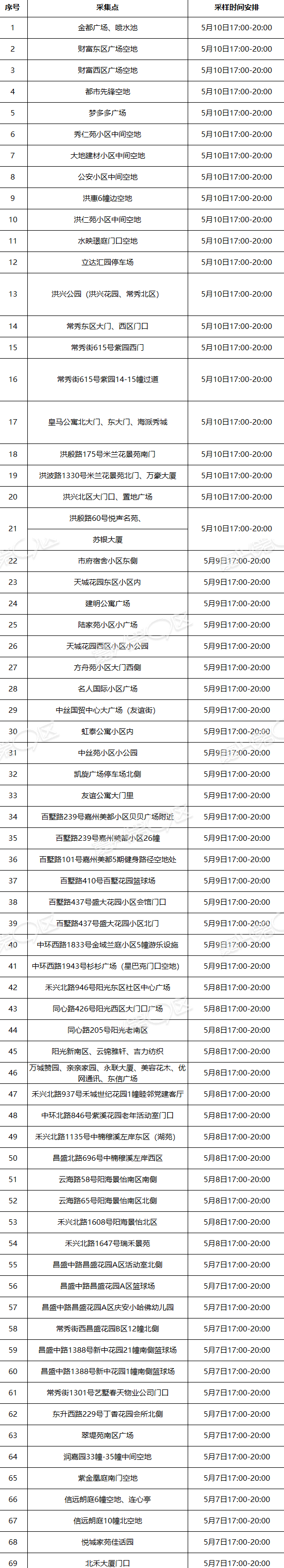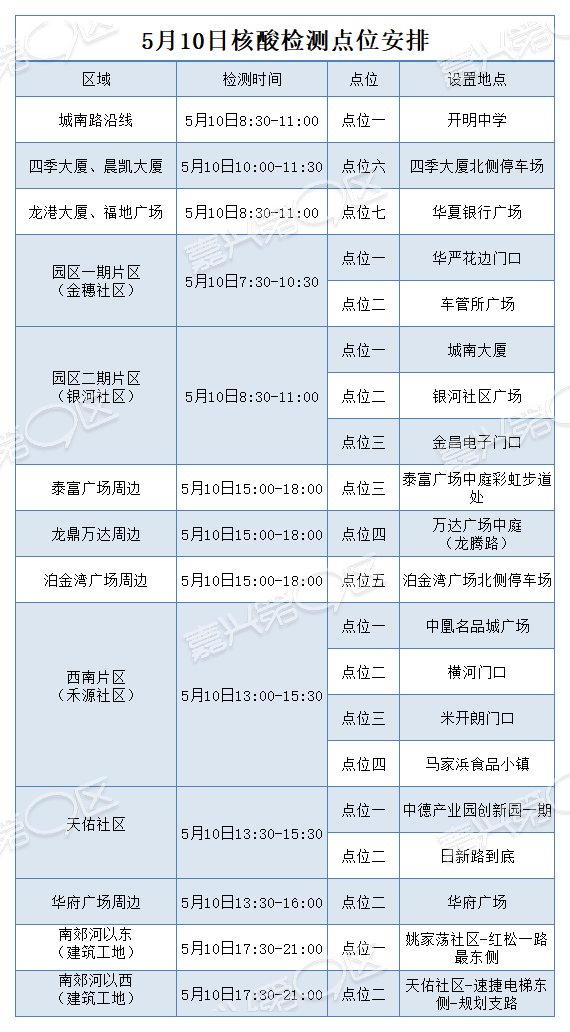 5月10日14:00-19:00:新塍镇、秀洲国家高新区; 5月11日14:00-19:00:王店镇、洪合镇。