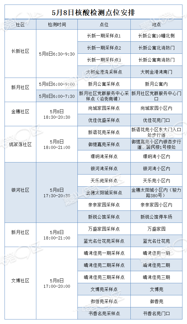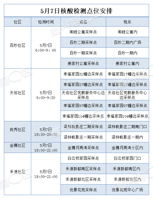 6.因医务人员统筹安排需要,5月7日至10日,全区基层医疗机构部分医疗服务以及部分“愿检尽检”采样点服务时间略有调整,具体详情请关注各街道社区卫生服务中心微信公众号。