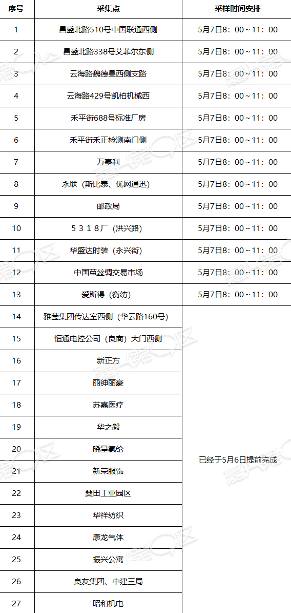 王江泾镇、油车港镇5月9日起分3天完成,具体时间根据镇里安排实施(其中毗邻嘉善的村继续按照5月7日起2天1次,检测3轮)。 三、温馨提示