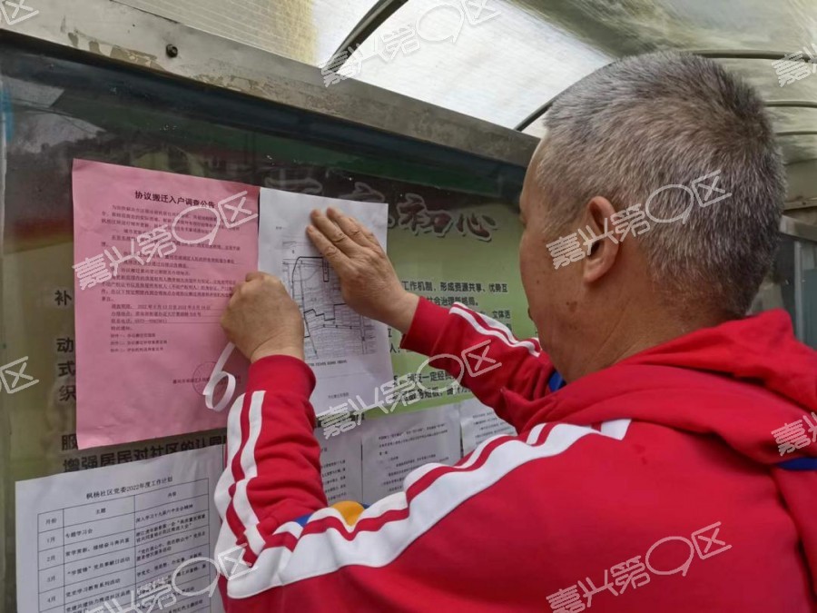 下午2点多,记者跟随南湖街道协议搬迁工作小组走进枫杨区块,工作人员将《协议搬迁入户调查公告》张贴在小区公告栏内,不少居民得知消息后,很快聚集到公告栏前。