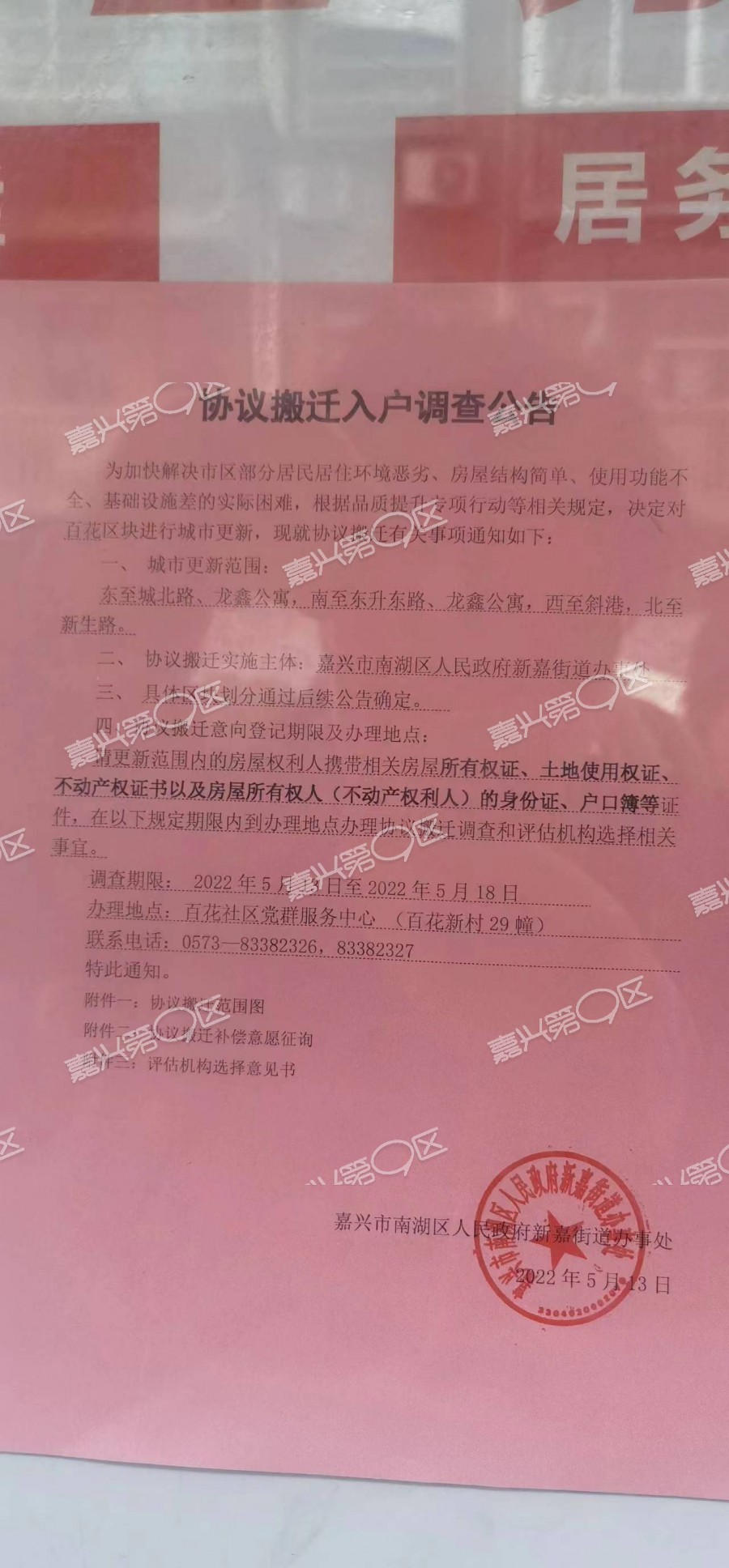 今天下午2时至4时,南湖区南湖街道枫杨区块(二毛二村地块、枫杨地块),解放街道外贸宿舍区块,新嘉街道百花区块先后贴出《协议搬迁入户调查公告》,标志着2022年南湖区中心城区城市更新工作全面启动。